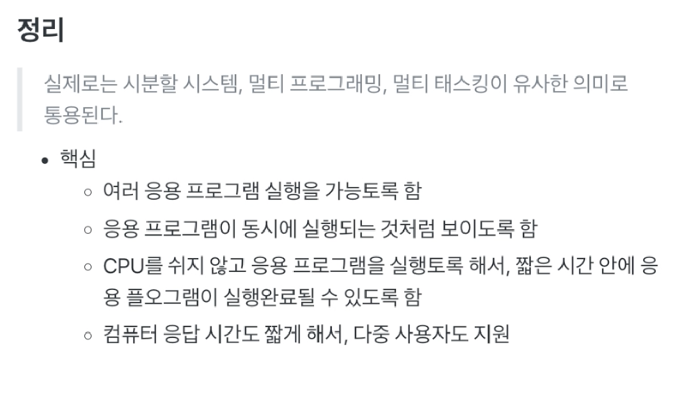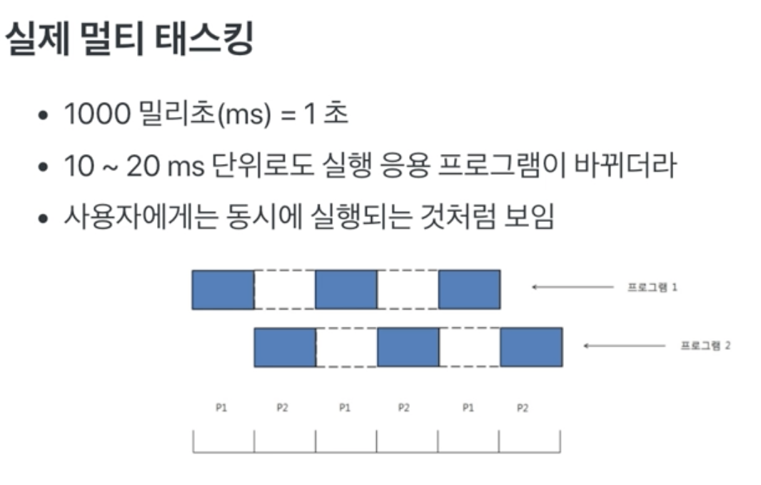 단일 cpu에서 , 여러 응용프로그래밍이 동시에 실행되는 것처럼 보이도록 하는 시스템 . 동시에 여러 작업을 하는 것이 아니다.
