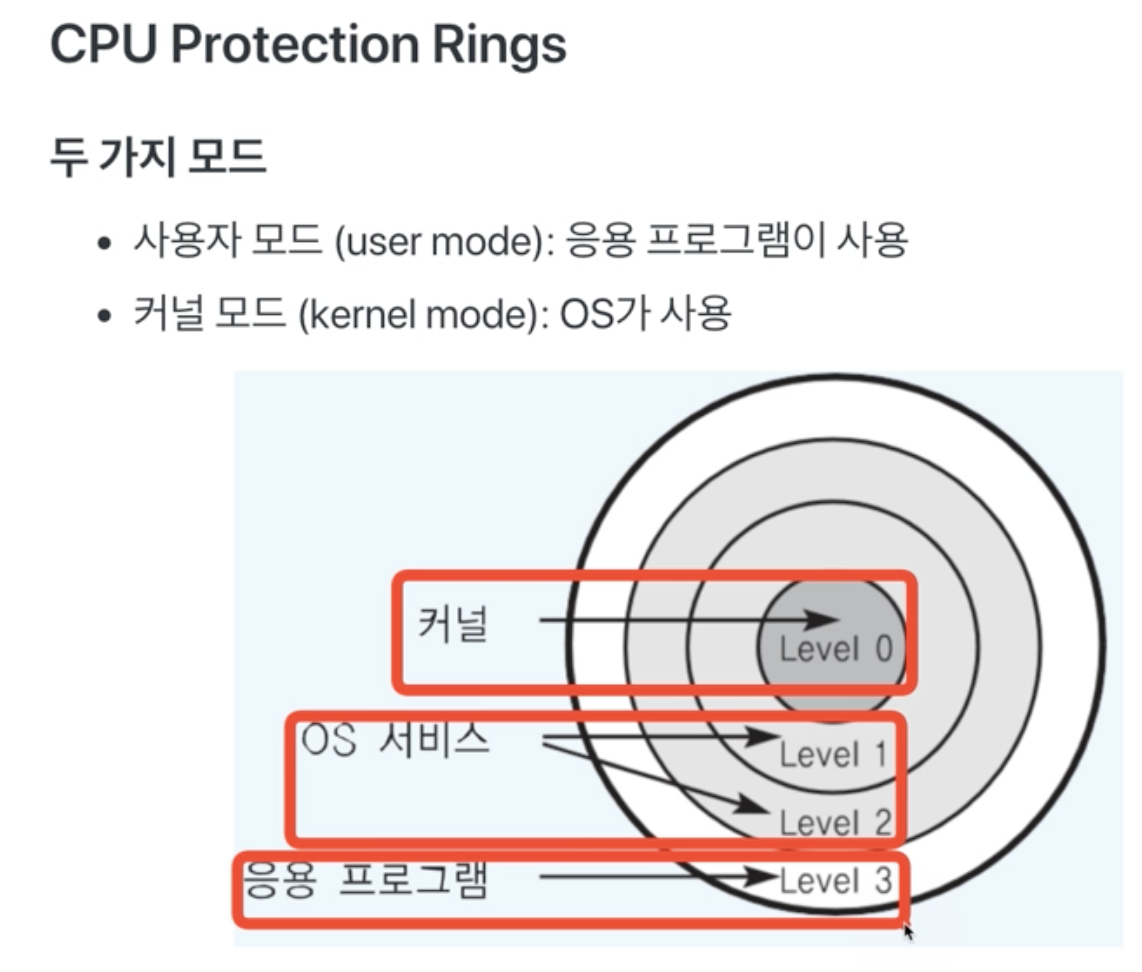 - 커널 모드 : 특정 명령어 실행과 원하는 작업 수행을 위한 작업 접근을 가능하게 하는 모드