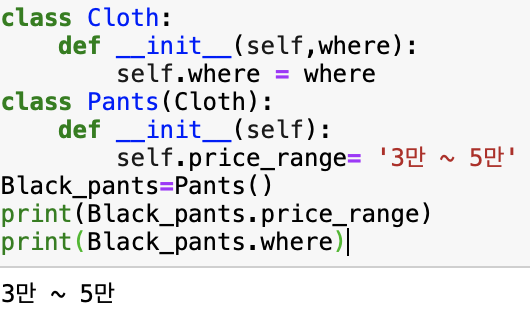 주의해야할 점은 부모의 __init__ 메소드에서 받는 where를 하위 클래스의 변수값과 super 안에 반드시 넣어줘야 한다.