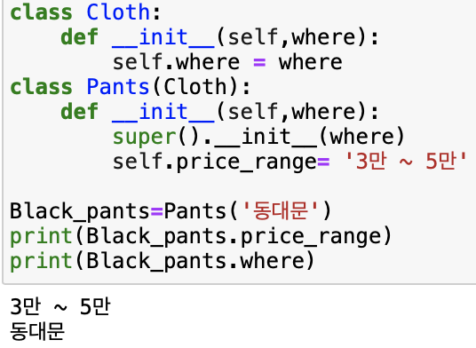 이러한 방법 , 의류라는 클래스에서 바지라는 클래스를 생성하는 것을 클래스의 상속이라고 부른다. 파이썬에서 클래스의 상속은 다음과 같이 작성한다.