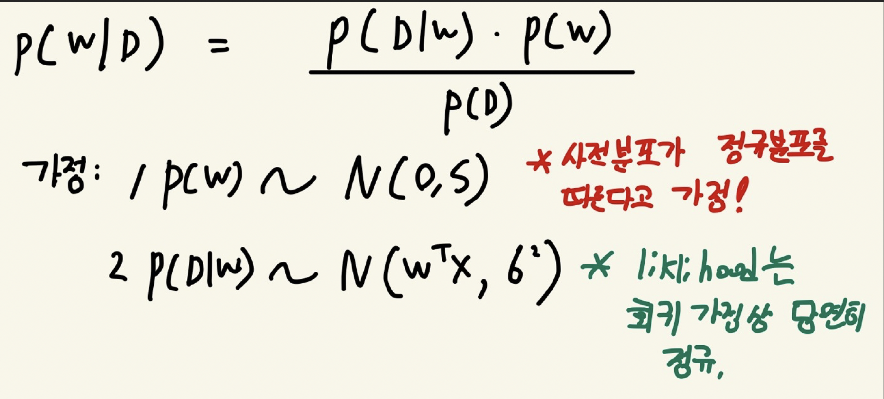 2. 두번째 가정의 경우 P(D|W)는 정규분포의 기존가정에 의하여 정규분포를 따르게 된다.