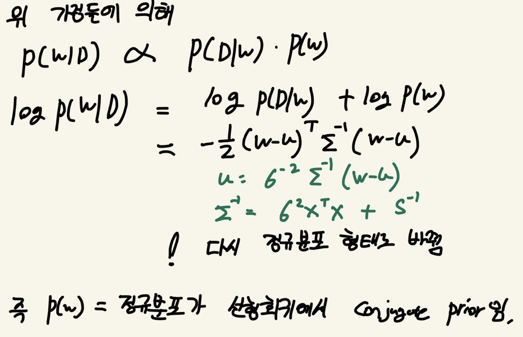 위에서 정의한 가정을 바탕으로 사후분포를 전개하면 다시 log( P (W | D ) ) 는 평균과 분산이 초록색 글씨를 따르는 정규분포의 형태로 바뀌게 된다. 즉 p(w)는 정규분포라는 가정이 p(w|D)의 정규분포를 만들어 냈으므로 선형회귀에서 정규분포는 conjugate prior이다.