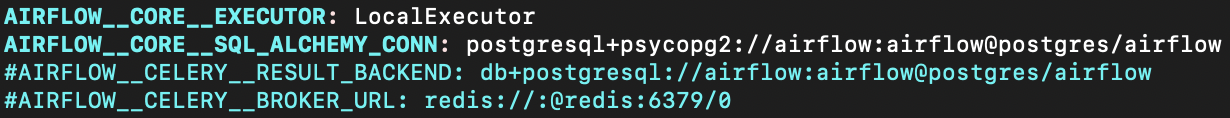 우선 다음과 같이 LocalExecutor로 바꿔주고 Celery Executor를 사용하지 않으므로 주석처리를 해준다.