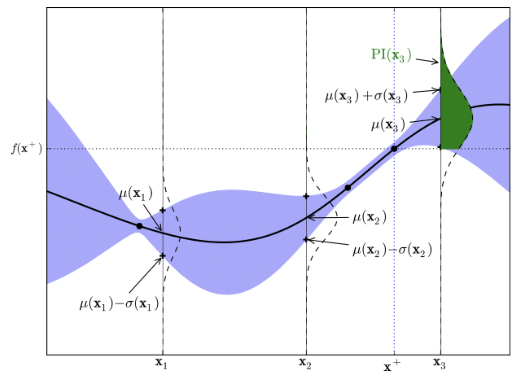 커널함수는 GP를 통해 모델을 학습할 때 사용되는데 관측치 ( 알고 있는 x_i) 와 가까울 경우 신뢰구간이 매우 좁아지고 멀 경우 신뢰구간이 점점 멀어지게 된다. 이 2가지 포인트 1. (베이지안 이므로) 점 추정이 아니라 확률분포로써 신뢰구간을 가짐. 2. 관측치와 가까운 지점은 신뢰구간이 매우 좁아지고 멀어질수록 신뢰구간이 커짐 ( 예를 들어 , f(100)을 추정함에 있어서 f(99)값이 f(1)값 보다 도움이 될 것 이라고 생각하는 것은 당연하다 . ) 를 바탕으로 다음 베이지안 옵티마이제이션을 이어서 설명하겠다.