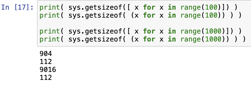 List comprehension 을 사용할 경우 iterator의 크기가 늘어남에 따라 메모리의 사용량이 크게 증가한다. 하지만 generator를 사용할 경우 112의 고정된 값이 사용하게 되는 걸 확인할 수 있다.