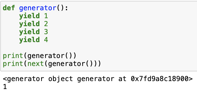 가장 먼저 generator 는 yield 를 이용하여 생성하며 next() 를 이용해서 접근할 수 있다.